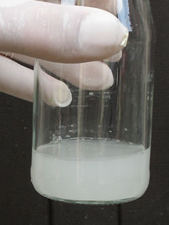 postupně vléváme do kolódia a promícháváme. Kolódium se okamžitě zakalí, bude mléčné.